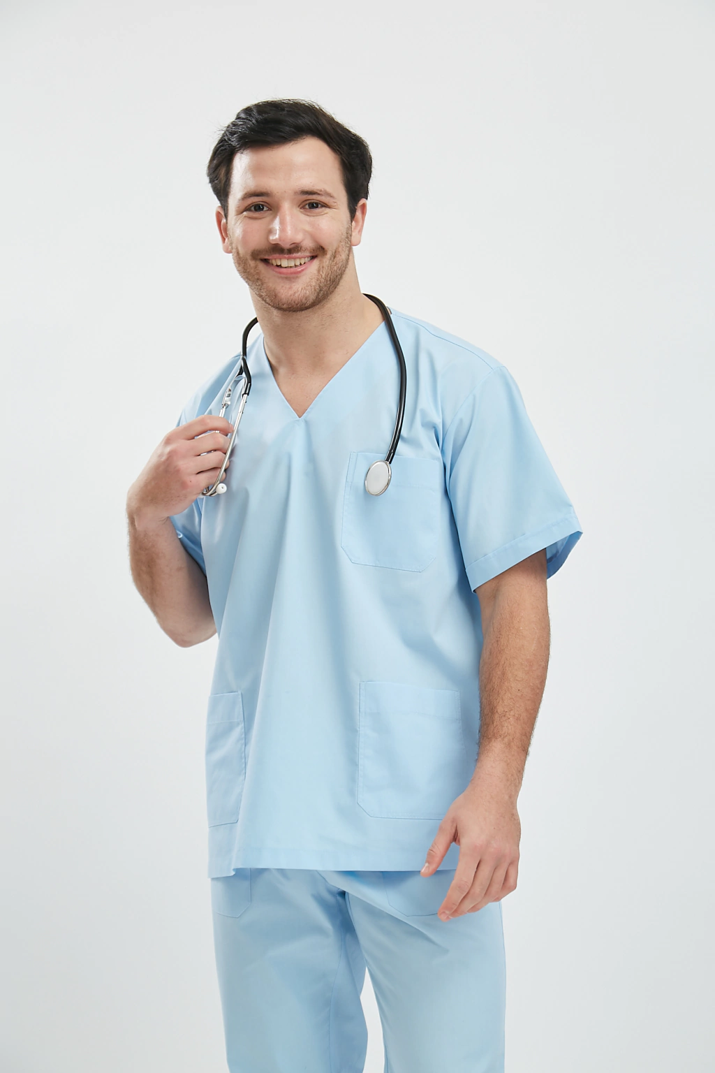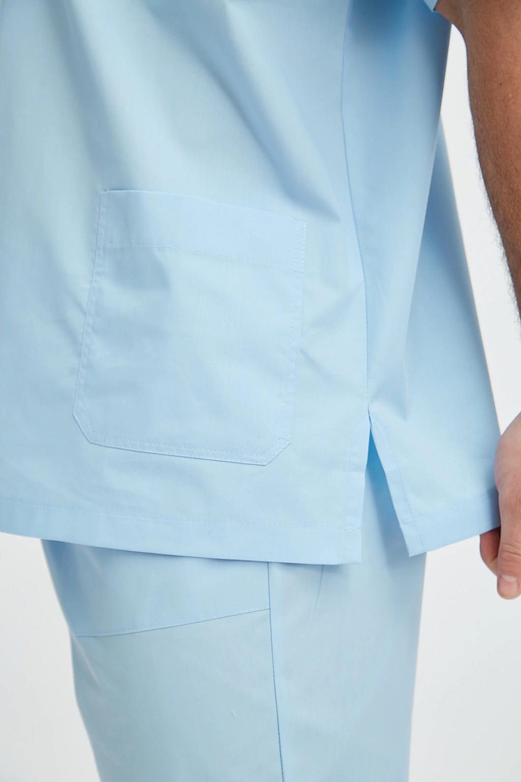 Clásico conjunto unisex con escote en V. La tela es Lavi Listo (65% Poliéster y 35% Algodón). Ideal para aquellos profesionales que necesitan una tela que les de movilidad y comodidad. Viene en varios colores. La chaqueta tiene dos bolsillos inferiores y uno a la altura del pecho. El pantalón es estilo náutico, con cintura elastizada. Tiene dos bolsillos delanteros y uno trasero.