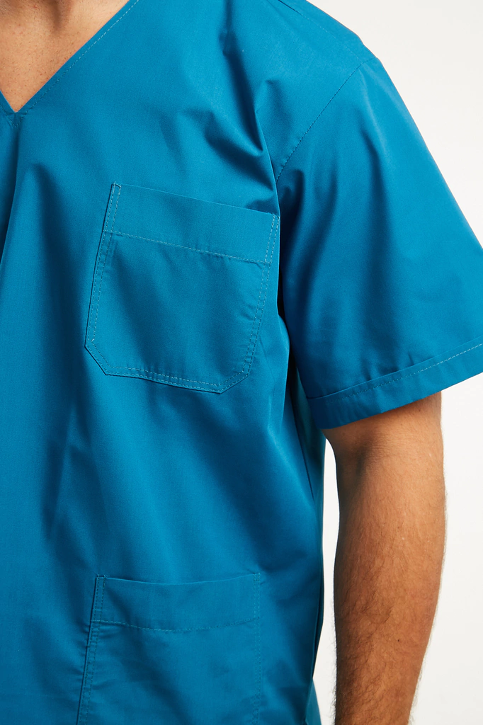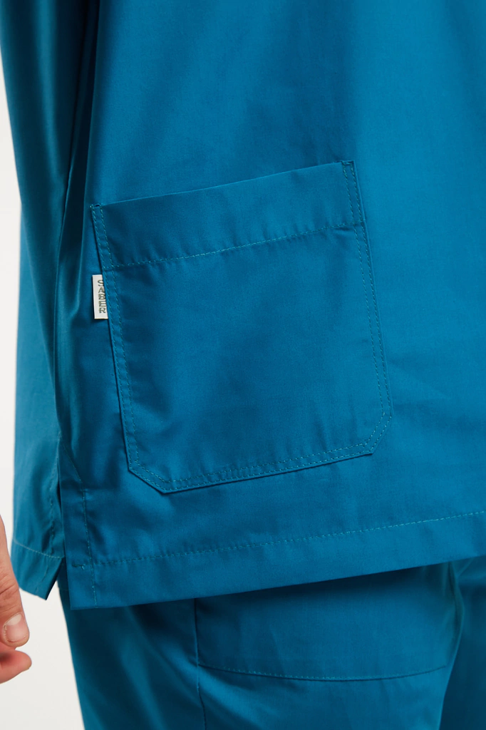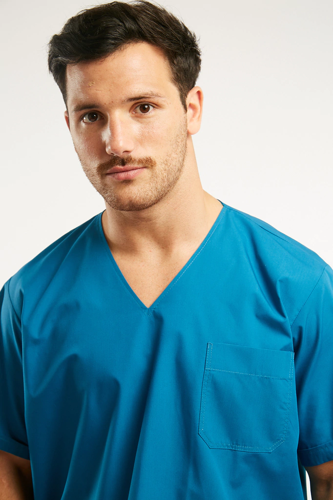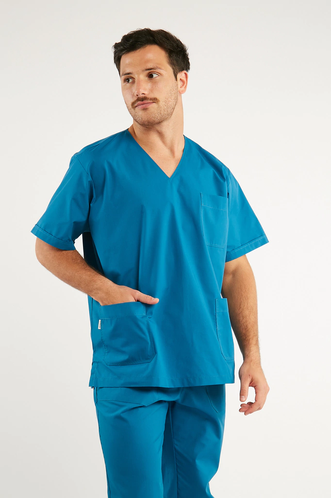 Clásico conjunto unisex con escote en V. La tela es Lavi Listo (65% Poliéster y 35% Algodón). Ideal para aquellos profesionales que necesitan una tela que les de movilidad y comodidad. Viene en varios colores. La chaqueta tiene dos bolsillos inferiores y uno a la altura del pecho. El pantalón es estilo náutico, con cintura elastizada. Tiene dos bolsillos delanteros y uno trasero.