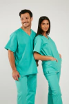 Clásico conjunto unisex con escote en V. La tela es Oxford (Algodón 75% y Poliéster 25%). Ideal para aquellos profesionales que necesitan una tela que les de movilidad y comodidad. Viene en varios colores. La chaqueta tiene dos bolsillos inferiores y uno a la altura del pecho. El pantalón es estilo náutico, con cintura elastizada. Tiene dos bolsillos delanteros y uno trasero.
