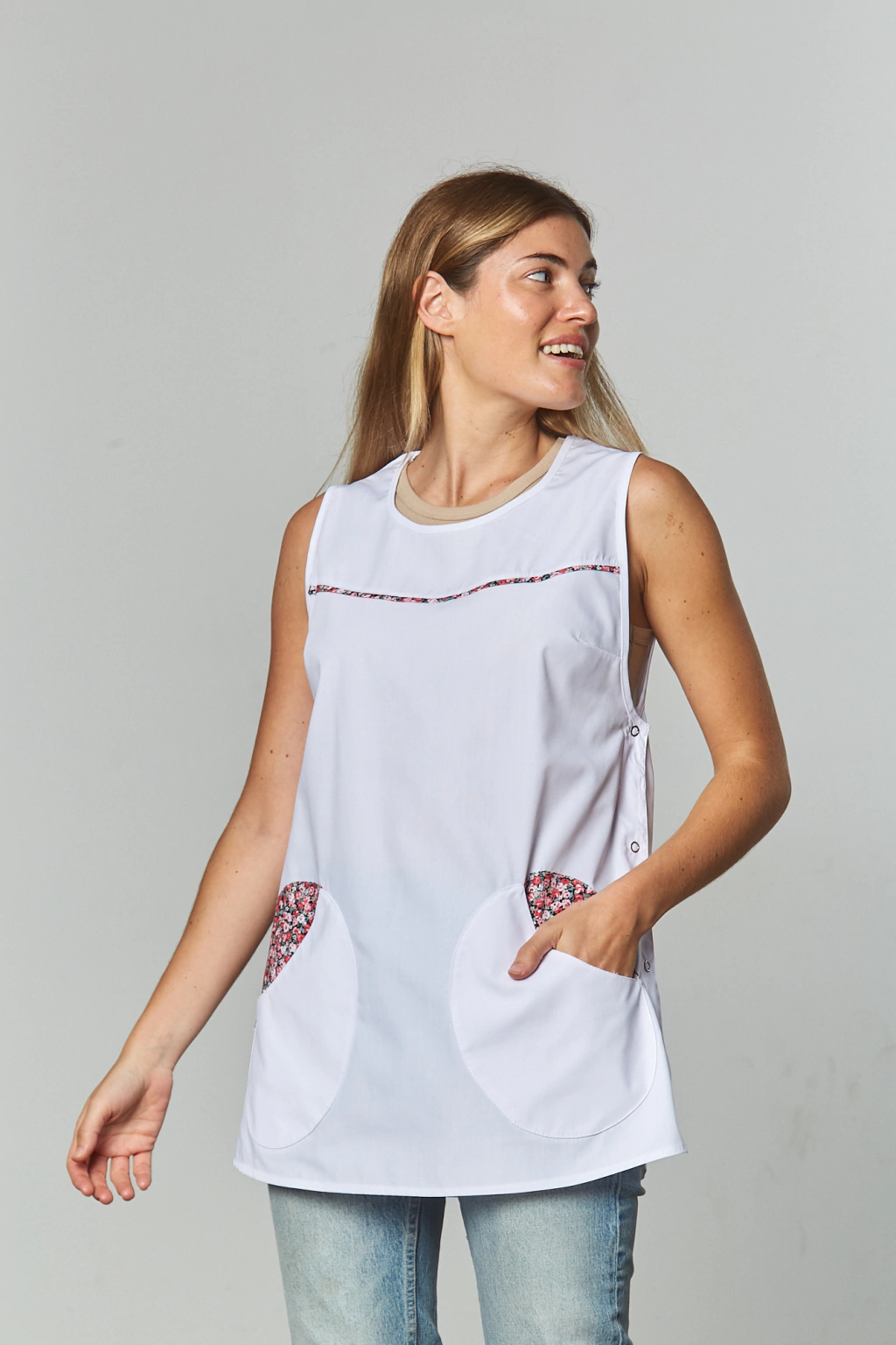 Esta camisola es levemente entallada a evasé. El diseño de sus bolsillos es en forma ovalada y con combinados, tiene broches en el costado izquierdo. Viene en tela Lavi Listo, Poliéster 65%, Algodón 35%, y también en tela cuadrillé.