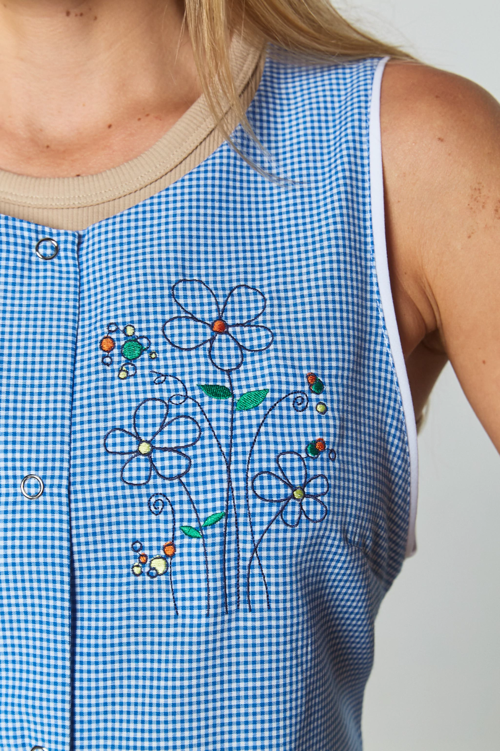 Camisola de dama cuadrillé, con broches metalicos a la vista en la parte delantera. Con un bordado en el pecho del lado izquierdo. Tiene escote redondo. Es de corte entallado. Tela base: Poliéster 65%, Algodón 35%.