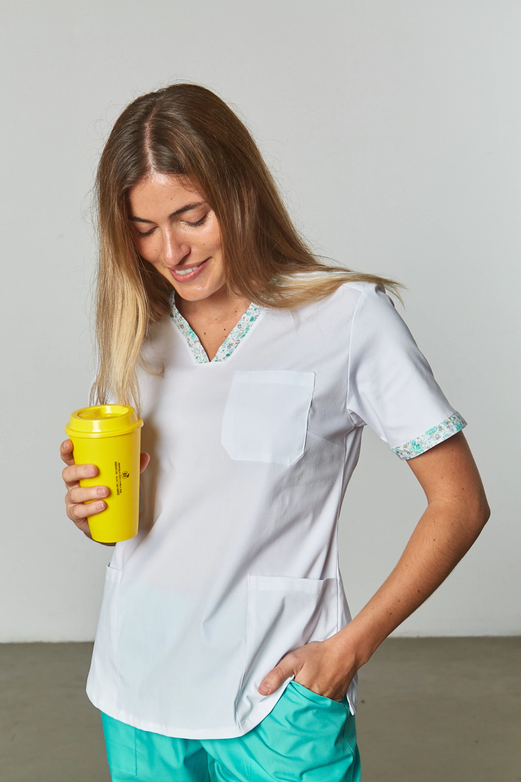 Casaca dama con escote en v. Corte entallado. Tiene un recorte en el hombro. Entalle en la espalda. Trae un bolsillo de pecho plaqué con división para lapicera, y dos bolsillos inferiores al ruedo. Su tela es 97% algodón y 3% elastano.