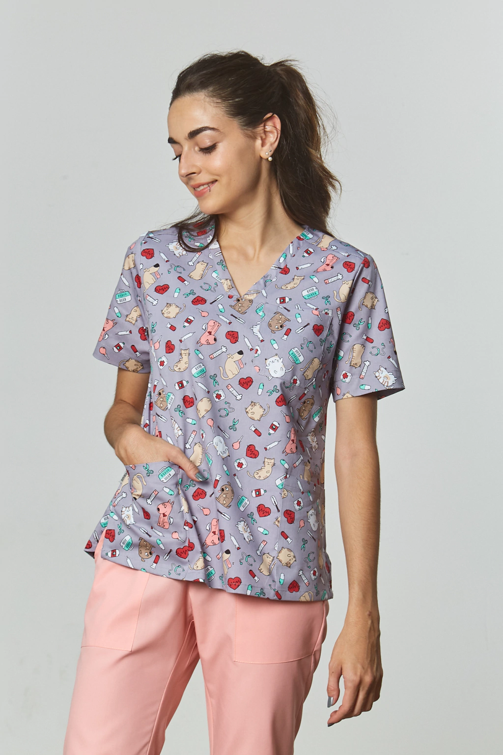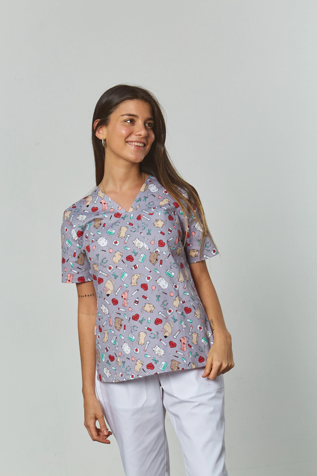 Casaca dama con escote en v. Corte entallado. Tiene un recorte en el hombro. Entalle en la espalda. Trae un bolsillo de pecho plaqué con división para lapicera, y dos bolsillos inferiores al ruedo. Su tela es 97% algodón y 3% elastano.