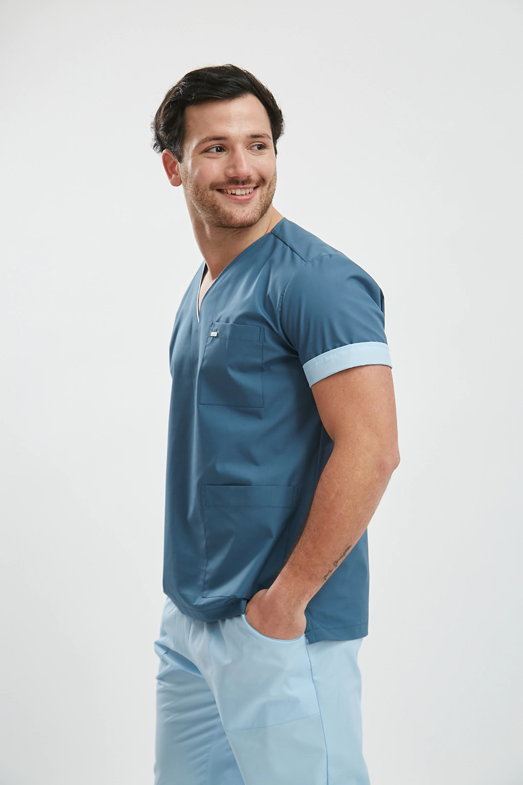 Chaqueta con entalle suave y escote en V. Con dos bolsillos inferiores amplios y un tercer bolsillo ideal para guardar el celular. Tiene un cuarto bolsillo a la altura del pecho. El escote es combinado y la botamanga también, que la podes doblar, para mangas mas cancheras y cortitas. La tela es Lavi Listo (Poliéster 65%, Algodón 35%).