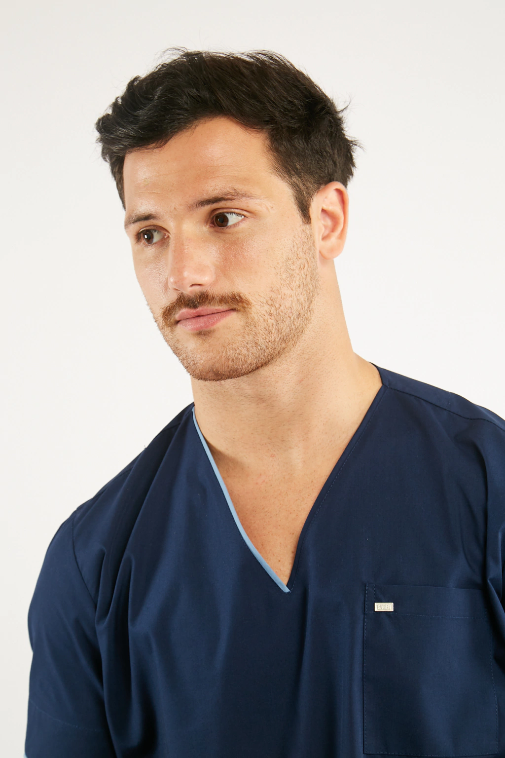 Chaqueta con entalle suave y escote en V. Con dos bolsillos inferiores amplios y un tercer bolsillo ideal para guardar el celular. Tiene un cuarto bolsillo a la altura del pecho. El escote es combinado y la botamanga también, en color azulino, que la podes doblar, para mangas mas cancheras y cortitas. La tela es Lavi Listo (Poliéster 65%, Algodón 35%).