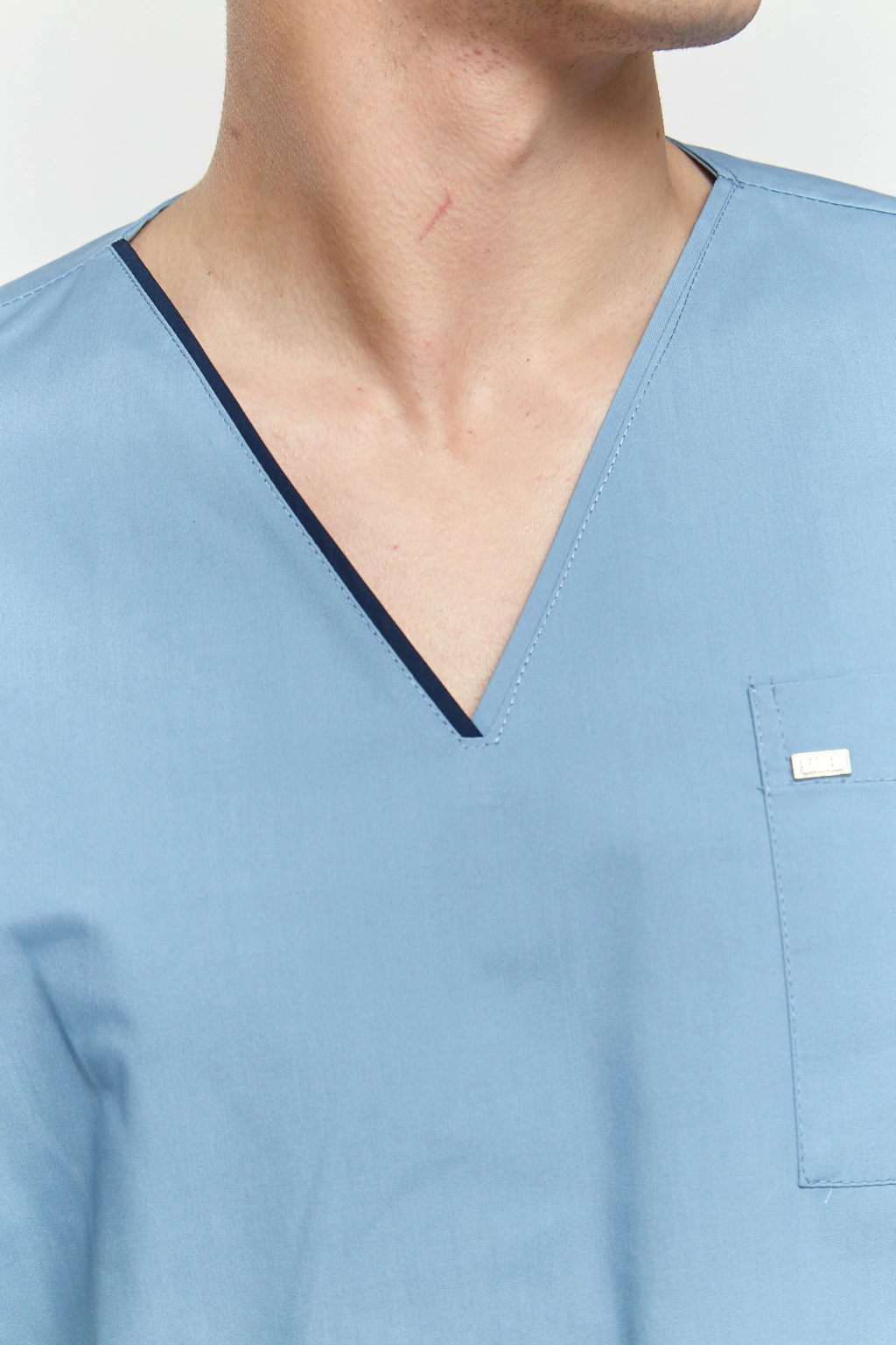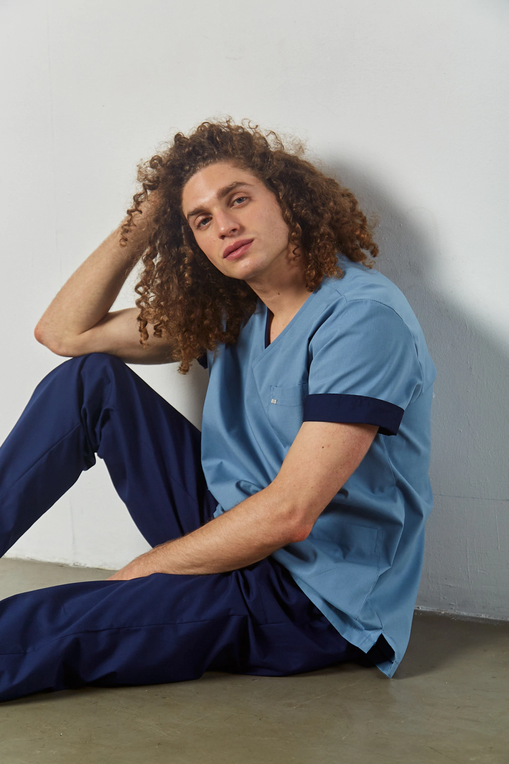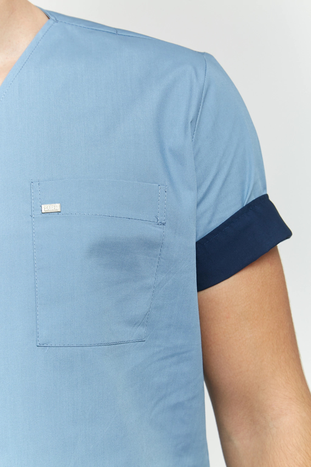 Chaqueta con entalle suave y escote en V. Con dos bolsillos inferiores amplios y un tercer bolsillo ideal para guardar el celular. Tiene un cuarto bolsillo a la altura del pecho. El escote es combinado y la botamanga también, en color azul marino, que la podes doblar, para mangas mas cancheras y cortitas. La tela es Lavi Listo (Poliéster 65%, Algodón 35%).