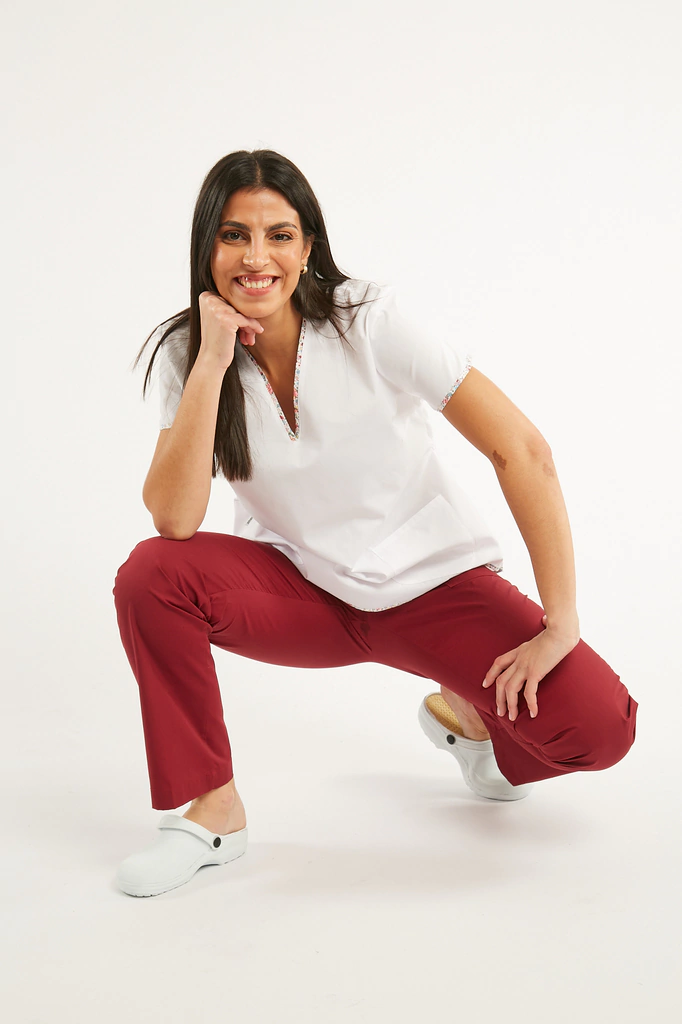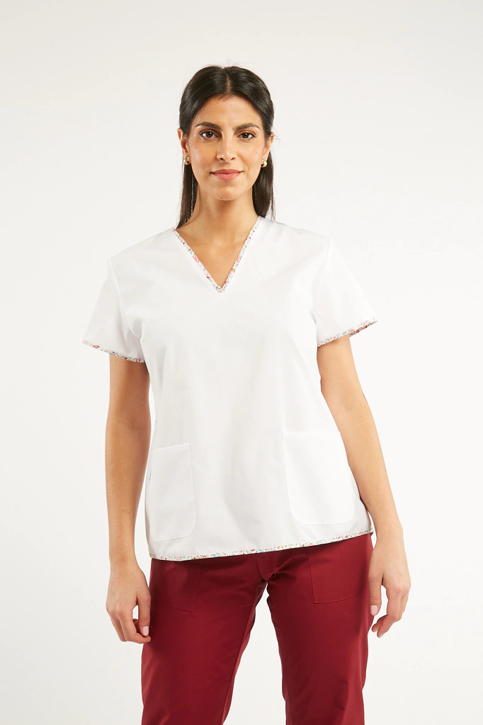 Chaqueta entallada escote en V, con tiritas para ajustar en la espalda a tu gusto. Viene con dos bolsillos inferiores y ribetes combinados en mangas, en escote y las tiritas. La tela es Lavi Listo (65% Poliéster y 35% Algodón).