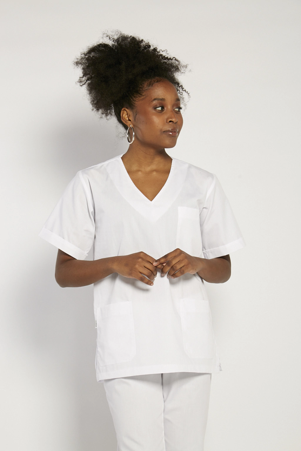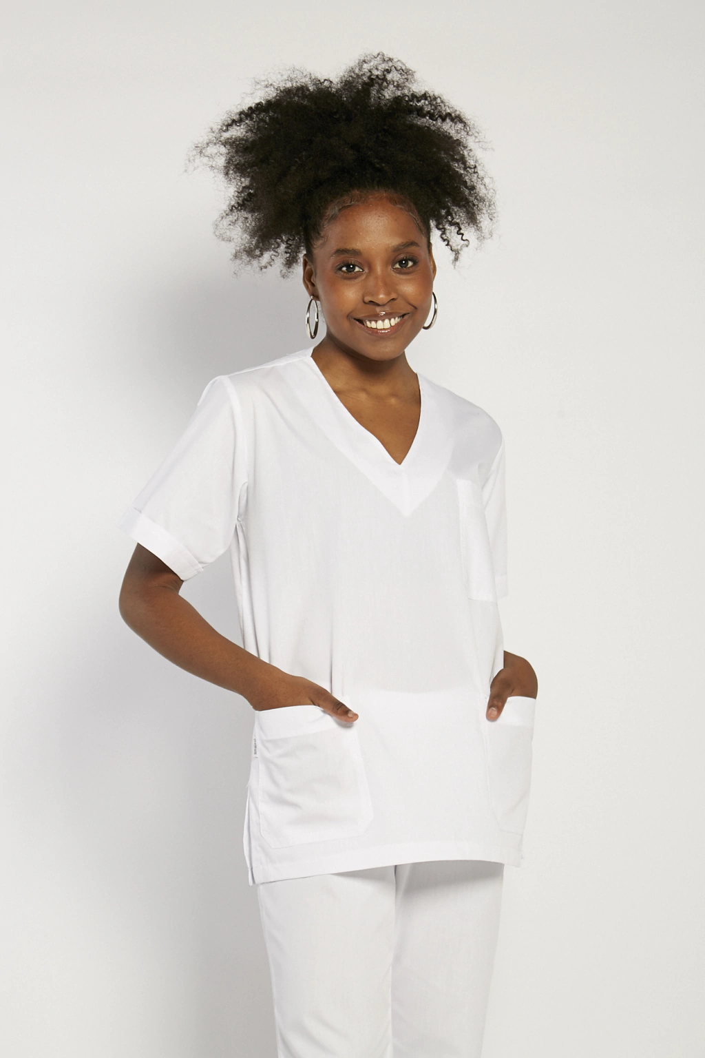 Casaca blanca lisa, con cuello en V y bolsillos plaqué, fácilmente combinable y muy cómoda. Es la casaca que pertenece al ambo Mendoza (modelo 9137) Su tela es Lavi Listo (65% poliéster, 35% algodón).