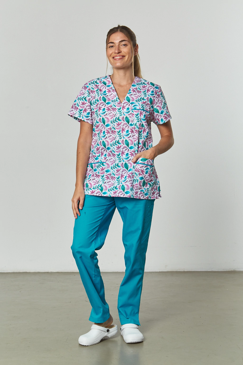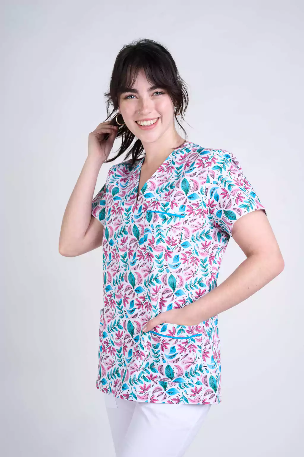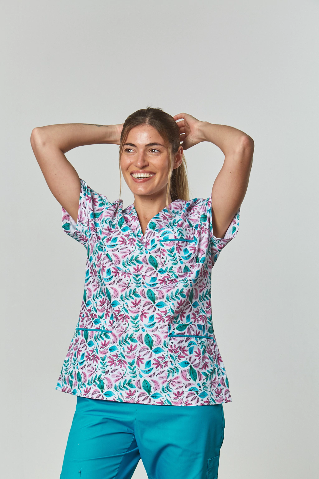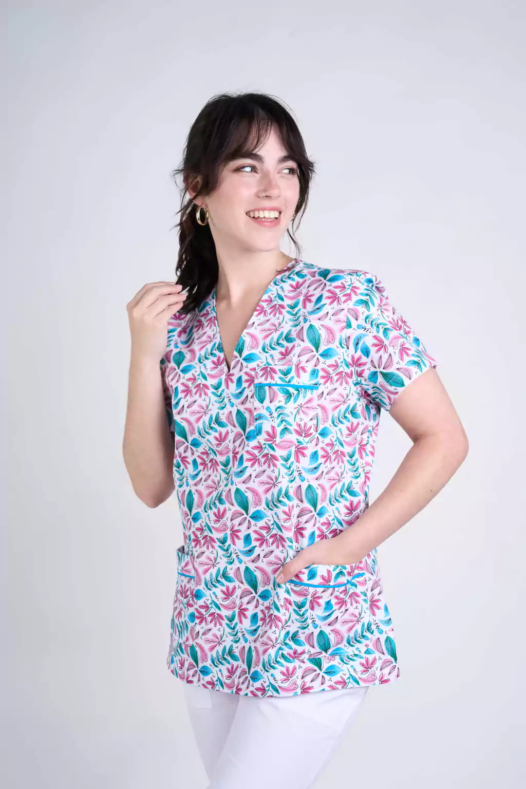 Casaca estampada escote en v, con bolsillos plaqué y vivos lisos, combinados a tono. Sus colores permiten que sea súper combinable con cualquiera de nuestros pantalones. Su Tela es Lavi Listo (65% poliéster, 35% algodón).