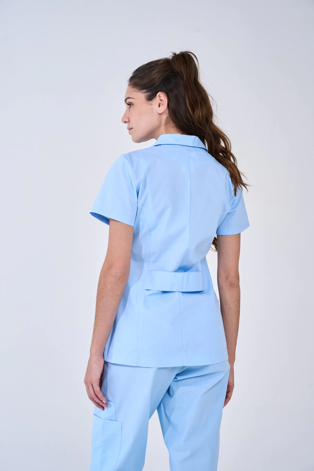 ¡La chaqueta Posadas color celeste claro es lo más! Con casaca cuello y solapa que marca la diferencia, esta prenda entallada es puro estilo. Viene con 3 bolsillos plaqué para llevar lo que quieras y se ajusta adelante con broches, ¿canchero, no? Las mangas son cortas y agregan onda con una martingala en la espalda. Fabricada en tela Lavi Listo (Poliéster 65%, Algodón 35%), es comodidad y estilo juntos.
