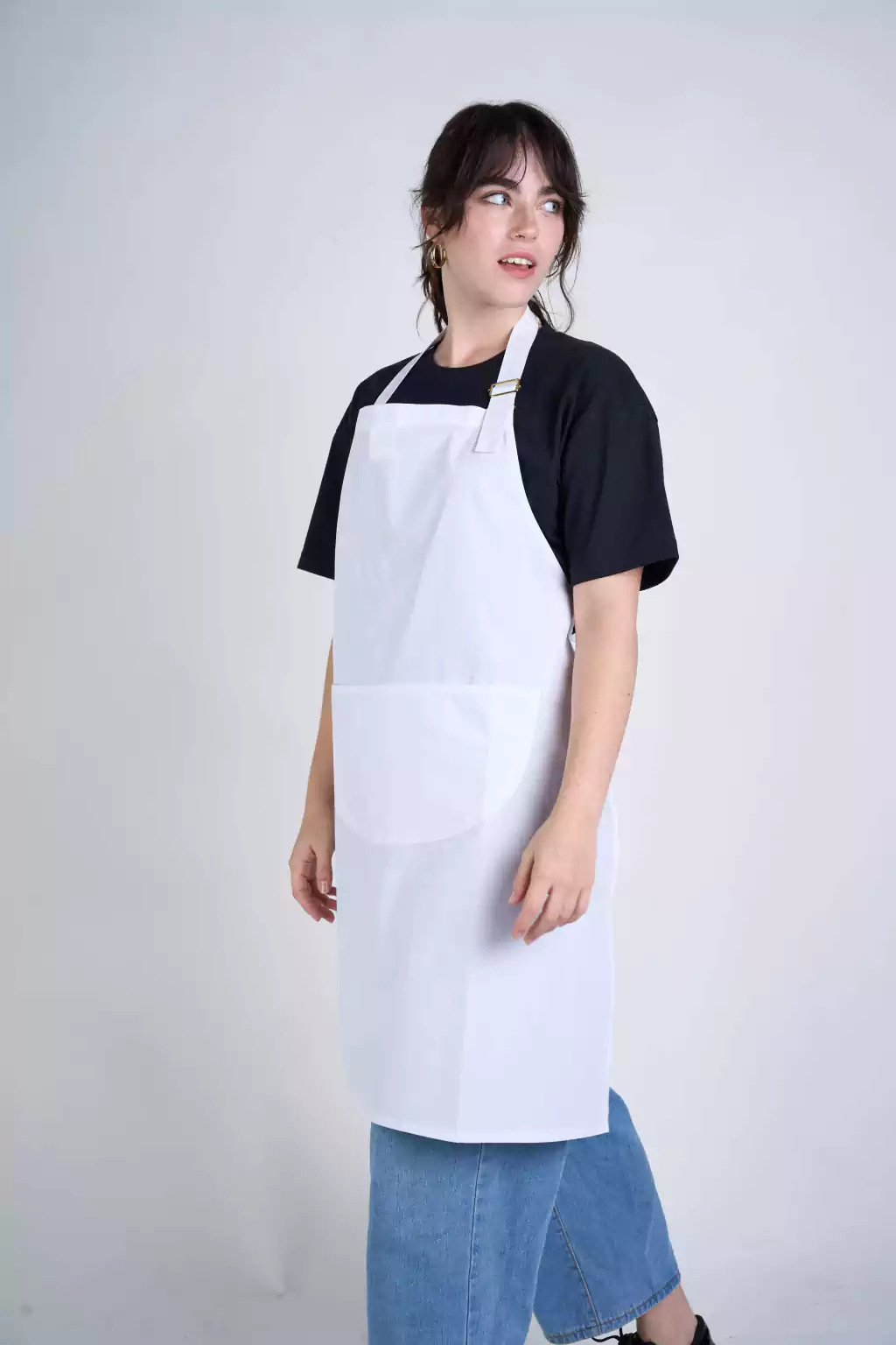 Delantal para usos múltiples. Tiene un bolsillo canguro y tira para el cuello con hebilla, para regular en altura, a los costados tiene tiras para ajustar.