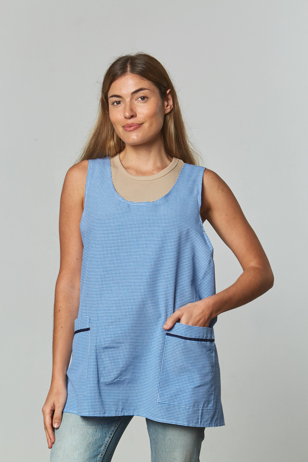 Poncho cruzado combinado, 2 bolsillos plaqué, con detalles en azul marino en tapas de bolsillos. En tela Lavi Listo (poliéster 65%, algodón 35%)