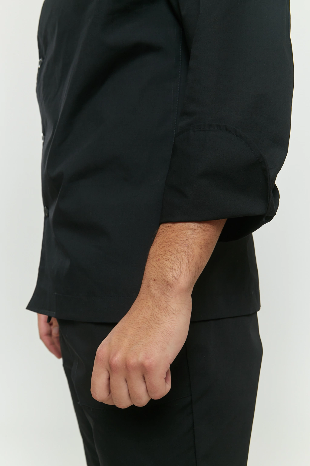 Saco de cocinero unisex. Corte saco. Cruzado en delantero con botones. Cuello tipo mao. Un bolsillo en la manga izquierda.